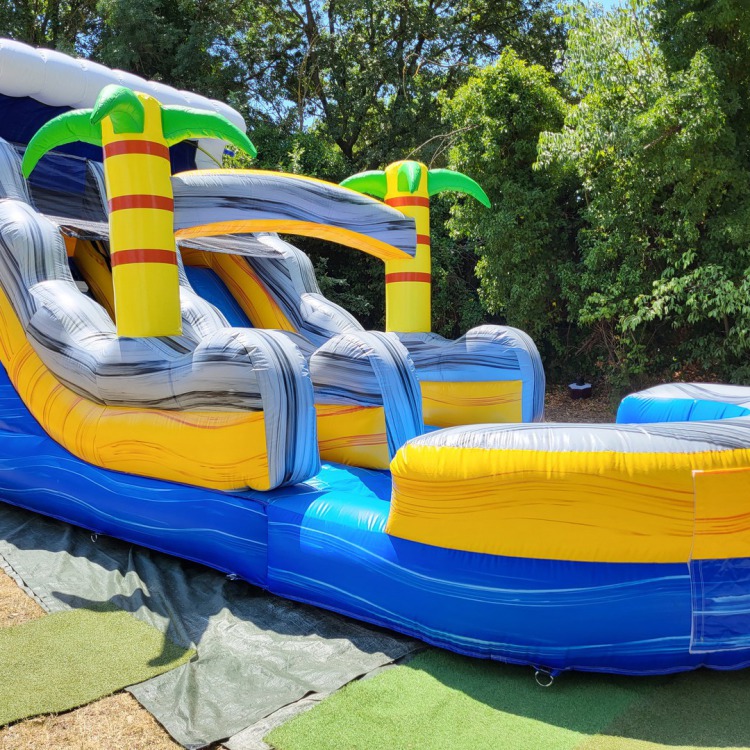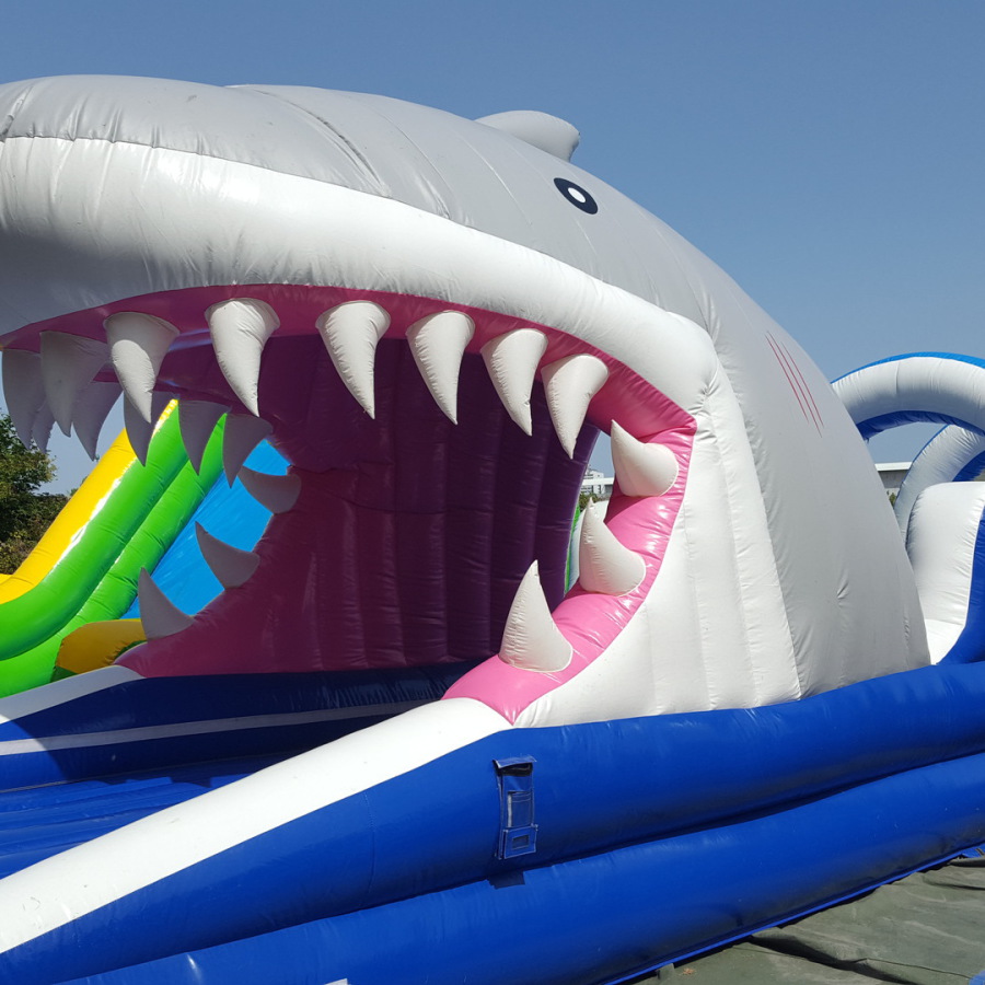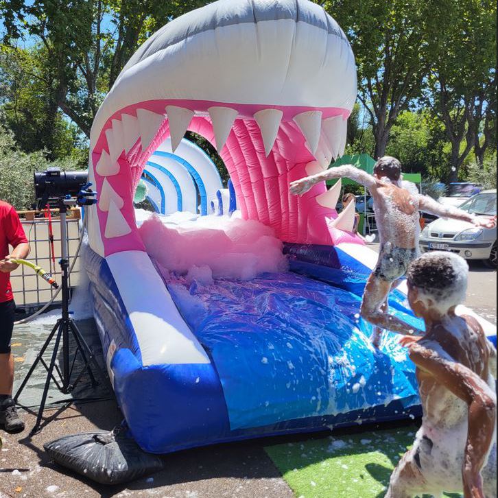 Ce ventriglisse gonflable requin permet aux enfants et adultes (à partir de 3 ans) de courir et glisser sur une piste aquatique pleine de sensationsavec une entrée originale par la gueule du requin